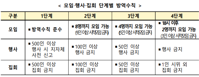 개편안에 따르면, 사회적 거리두기 단계가 국민에게 주는 메시지를 보다 명확히 하기 위해 기존 5단계(1, 1.5, 2, 2.5, 3단계) 거리두기 체제를 4단계로 줄인다.